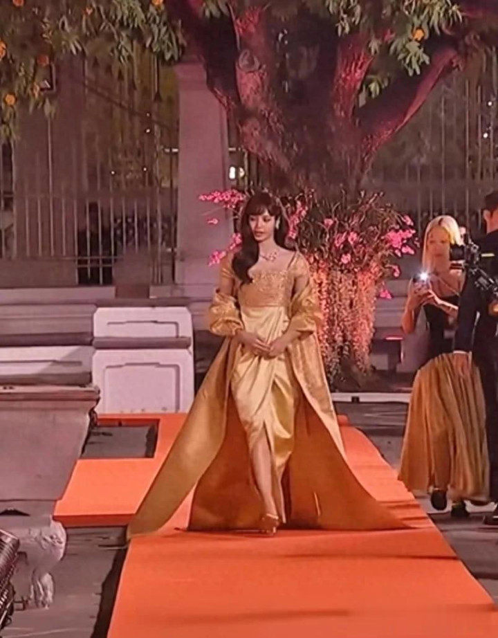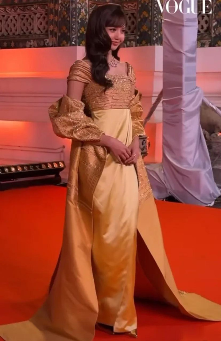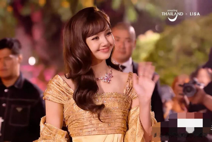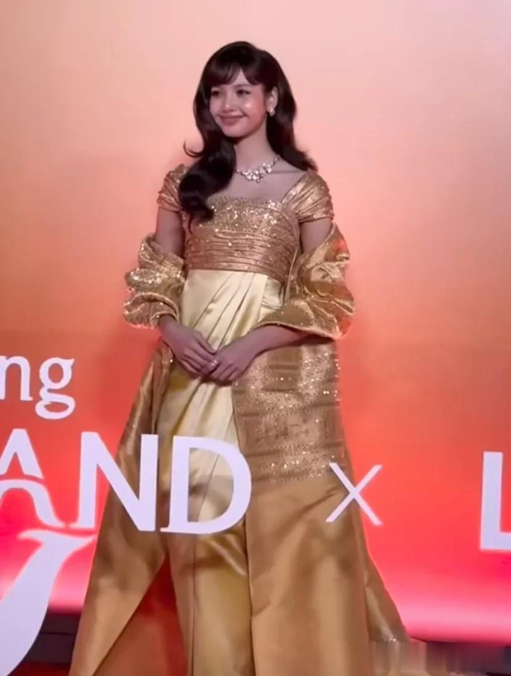 Lisa身穿一袭金色长裙,裙子主要以金色为主,搭配长款披肩,虽然不是泰国传统服饰,却泰味十足,很适合这种场合。